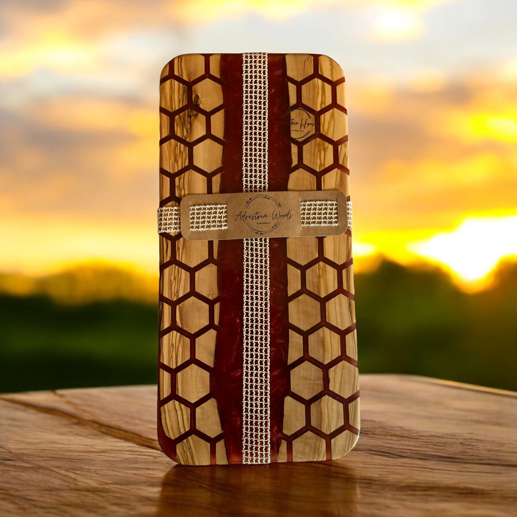 Product Description: This unique cutting and serving board is crafted from high-quality wood, featuring a captivating combination of natural wood grain and vibrant orange resin inlays with a honeycomb pattern. The board's intricate design and sturdy construction make it perfect for serving a variety of cheeses, appetizers, and snacks, adding a touch of elegance to any kitchen or dining area.